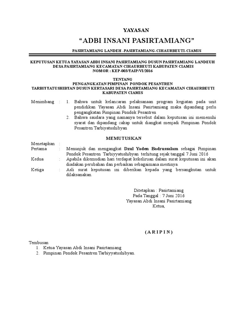 Contoh Sk Kepengurusan Lembaga Pp Yayasan Mdta Word Doc from www.siajun.com Maybe you would like to learn more about one of these? Check spelling or type a new query. We did not find results for: Sk pengangkatan pengasuh pondok pesantren.